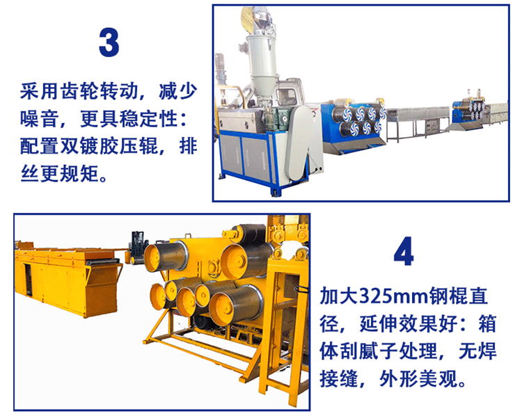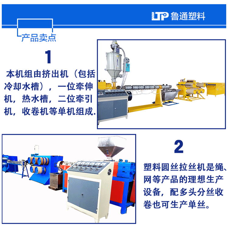 本机组是以聚丙烯(PP),高密度聚乙烯(HDPE)为原料制成各种规格 的圆丝,通过相应调整可用于其他塑料丝加工。